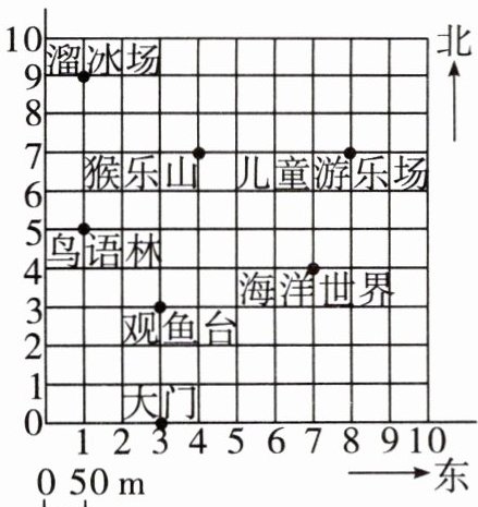 海洋世界在大门北偏东约$280m$,$280÷50 = 5.6$格,根据方向和距离可确定其位于$(7,4)$。