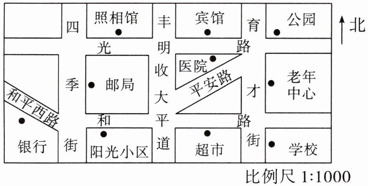 从阳光小区出发,沿和平大道向北走到平安路,再沿平安路向东北方向走到丰明路,最后沿丰明路向北走到公园。