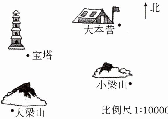 五、一支森林考察队在大梁山考察时迷失了方向,你能确定大本营相对大梁山的位置吗?你能根据比例尺算出大梁山到大本营的距离吗?(11分)