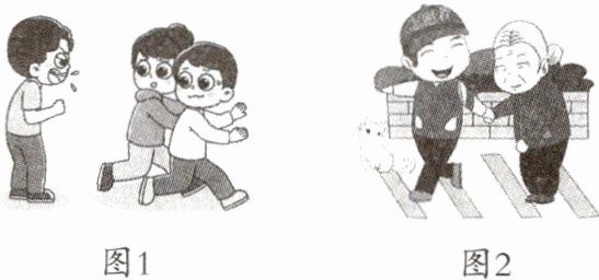 我们经常说“以和为贵”,“和”让我们沟通顺畅,相处融洽。 我们不能像图1中的男子那样出口伤人,赶走了他人,阻断了沟通渠道;应该向图2中的志愿者学习,和善助人,让美好与快乐充满生活。