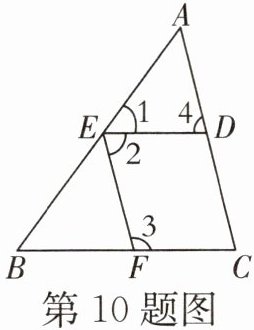 10. 如图,点D,E,F分别在三角形ABC的AC,AB,BC边上,连接DE,EF,若$∠1= ∠B,∠2= ∠C,∠4= 75^{\circ }$,则$∠3$的度数为(