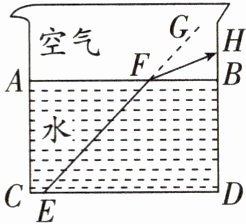 5. 光线在不同介质中传播速度不同,从一种介质射向另一种介质时会发生折射.如图,水面AB与水杯下沿CD平行,光线EF从水中射向空气时发生折射,光线变成FH,点G在射线EF上,已知∠HFB= 20°,∠FED= 45°,则∠GFH的度数为______