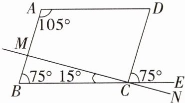 (1) $\because \angle A = 105^{\circ}$,$\angle B = 75^{\circ}$,$\therefore \angle A + \angle B = 180^{\circ}$,$\therefore AD // BC$;又$\because \angle DCE = 75^{\circ}$,$\angle B = 75^{\circ}$,$\therefore \angle DCE = \angle B$,$\therefore AB // DC$。