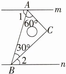 4. 已知直线m//n,将一块含30°角的直角三角板ABC(∠ABC= 30°,∠BAC= 60°)按如图方式放置,点A,B分别落在直线m,n上.若∠1= 70°,则∠2的度数为(
