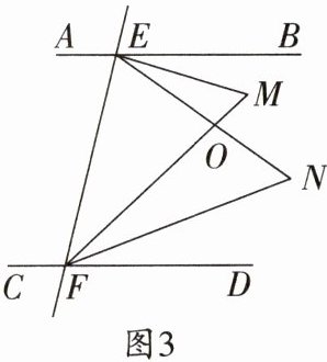 (3)如图 3,若 $ \angle EOF $的度数为 $ \alpha $,$ EM $平分 $ \angle BEO $交 $ FO $的延长线于点 $ M $,$ FN $平分 $ \angle DFO $交 $ EO $的延长线于点 $ N $,求 $ \angle M + \angle N $的度数(用含 $ \alpha $的式子表示).