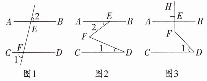 (2)猜想的结论是:$ \angle 1 + \angle 2 = \angle EFD$。理由:如图 1,过点 F 作 $FG // AB$。因为 $FG // AB$,$AB // CD$,所以 $AB // FG // CD$,所以 $ \angle 1 = \angle DFG$,$ \angle 2 = \angle EFG$,所以 $ \angle 1 + \angle 2 = \angle DFG + \angle EFG$。因为 $ \angle DFG + \angle EFG = \angle EFD$,所以 $ \angle 1 + \angle 2 = \angle EFD$;