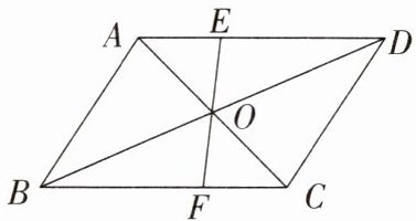 8. (河口区期末)如图,$EF过□ ABCD对角线的交点O$,交$AD于点E$,交$BC于点F$,则:①$OE = OF$;②图中共有4对全等三角形;③若$AB = 4$,$AC = 6$,则$2 < BD < 14$;④$S_{\text{四边形}ABFE} = S_{\triangle ABC}$.其中正确的结论有(