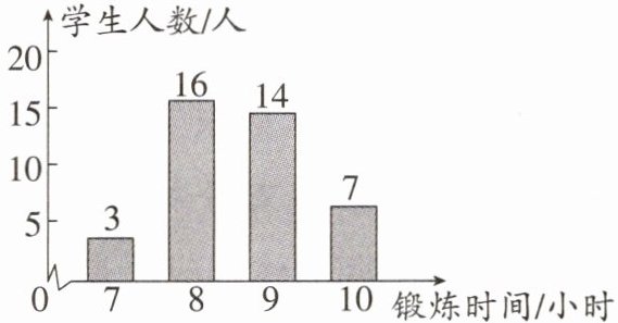 根据条形统计图可知,一周锻炼$7$小时的有$3$人,一周锻炼$8$小时的有$16$人,一周锻炼$9$小时的有$14$人,一周锻炼$10$小时的有$7$人。