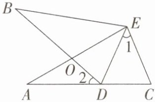 6. 如图,$∠A= ∠B,AE= BE$,点 D 在边 AC 上,$∠1= ∠2$,AE 和 BD 相交于点 O.