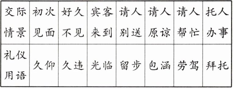 |交际情景|初次见面|好久不见|宾客来到|请人别送|请人原谅|请人帮忙|托人办事|