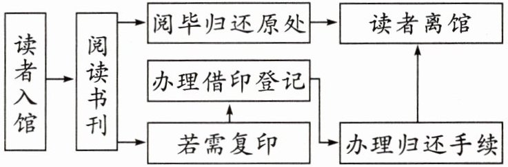 示例:读者入馆阅读书刊,阅毕后将书归还原处方可离馆;若需复印,须办理借印登记,复印后办理归还手续,之后才可离馆。