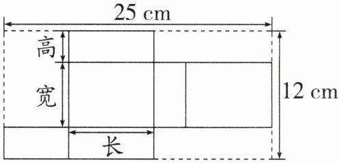 (1)设长方体的高为$x$cm,则长方体的宽为$(12 - 2x)$cm。根据展开图可知,$12 - 2x + 8 + x + 8 = 25$,解得$x = 3$。所以长方体的高为$3$cm,宽为$12 - 2×3 = 6$cm,长为$8$cm。长方体的体积为$8×6×3 = 144$ $cm³$。