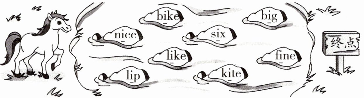 三、将含有 five 画线部分读音的单词连成一条路线,帮助小马到达终点。