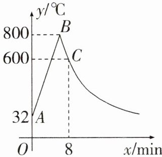 21. (8分)工匠制作某种金属工具要进行材料煅烧和锻造两个工序,即需要将材料煅烧到$ 800^{\circ}C $,然后停止煅烧进行锻造操作.第8min时,材料温度降为$ 600^{\circ}C $,煅烧时,温度$ y(^{\circ}C) $与时间$ x(min) $成一次函数关系;锻造时,温度$ y(^{\circ}C) $与时间$ x(min) $成反比例关系(如图),已知该材料初始温度是$ 32^{\circ}C $.