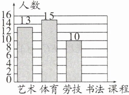 4. 某校开设了艺术、体育、劳技、书法四门拓展性课程,要求每一位学生都要选且只能选其中一门课.小黄同学统计了本班50名同学的选课情况,并将结果绘制成条形统计图(如图,不完整),则选书法课的人数有( )