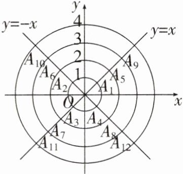 8. 如图,在直角坐标系中,以原点 $ O $ 为圆心的同心圆的半径,由内向外依次为 1,2,3,4,$ \cdots $,同心圆与直线 $ y = x $ 和 $ y = - x $ 分别交于 $ A _ { 1 } $,$ A _ { 2 } $,$ A _ { 3 } $,$ A _ { 4 } $,$ \cdots $,则点 $ A _ { 30 } $ 的坐标是( )