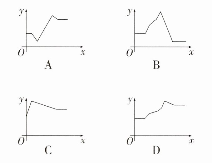 8. 乌鸦口渴到处找水喝,它看到了一个装有水的瓶子,但水位较低,且瓶口又小,乌鸦喝不着水,沉思一会儿后,聪明的乌鸦衔来一个个小石子放入瓶中,水位上升后,乌鸦喝到了水.在这则乌鸦喝水的故事中,从乌鸦看到瓶子的那刻起开始计时,并设时间为 x,瓶中水位的高度为 y,下列图像中最符合故事情景的是 ( )