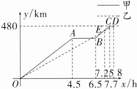 21. 某市接到上级通知,派出甲、乙两个抗震救灾小组同时乘车沿同一路线赶赴距出发点 480 km 的灾区.图中的折线、线段分别表示甲、乙两组所走的路程 $y_{甲}(km),y_{乙}(km)$ 与时间 $x(h)$ 之间的函数关系对应的图像.请根据图像所提供的信息,解决下列问题: