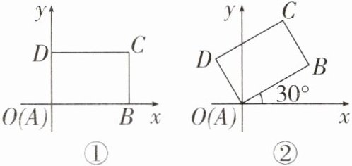 13. 如图,先将一矩形 ABCD 置于直角坐标系中,使点 A 与坐标系的原点重合,边 AB,AD 分别落在 x 轴、y 轴上(如图①所示),再将此矩形在坐标平面内按逆时针方向绕原点旋转 30°(如图②所示),如果 AB=4,BC=3,那么图①和图②中,点 B 的坐标分别为________,点 C 的坐标分别为________.