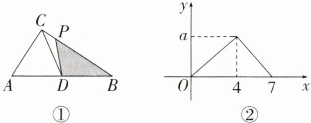 5. 如图,在 $Rt\triangle ABC$ 中,$∠ACB = 90^{\circ}$,$D$ 为斜边 $AB$ 的中点,动点 $P$ 从 $B$ 点出发,沿 $B→C→A$ 运动,如图①所示,设 $S_{\triangle DPB} = y$,点 $P$ 运动的路程为 $x$,若 $y$ 与 $x$ 之间的函数图像如图②所示,则 $a$ 的值为 ( )