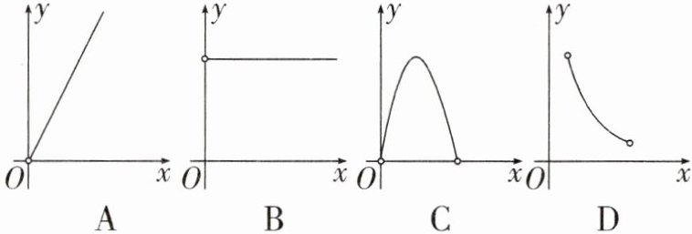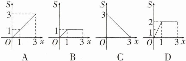 1. 如图,在矩形 $ABCD$ 中,$AB = 2$,$BC = 1$,动点 $P$ 从点 $B$ 出发,沿路线 $B→C→D$ 作匀速运动,那么 $\triangle ABP$ 的面积 $S$ 与点 $P$ 运动的路程 $x$ 之间的函数图像大致是 ( )