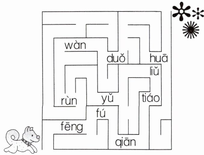 请你帮小花狗找到礼花,并读出沿途的拼音,看看能组成一副怎样的春联,然后写下来。
