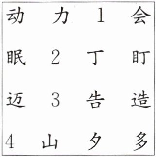 开动脑筋想一想,出现在图中的1、2、3、4会是些什么字呢?如果要正确地回答这个问题,可根据同一行出现的汉字找出规律,得出答案。如果按照从1到4的顺序把这些汉字连起来,将是一句什么话?写下来。