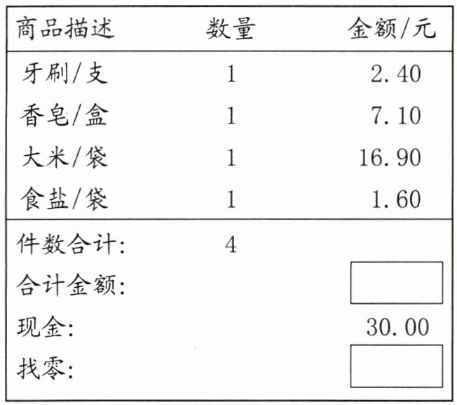 2. 下图所示是妈妈在超市购物后取回的小票,你能把它补充完整吗?