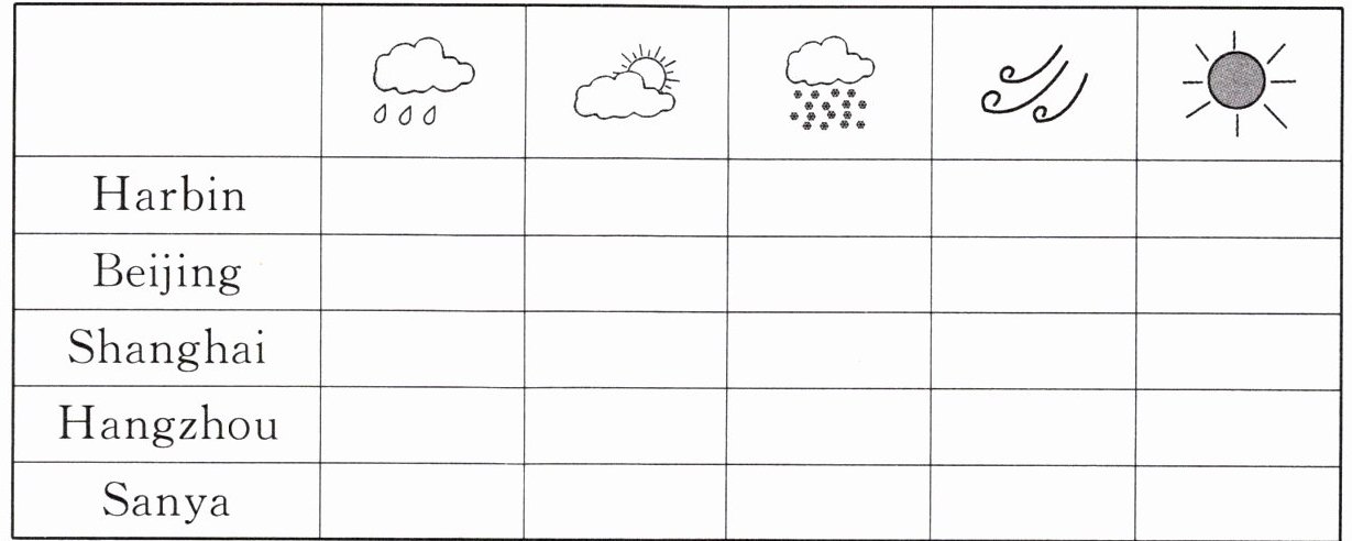 二、Sarah 受学校广播站邀请,正在用英语播报天气预报。请根据所听内容,在表格相应的栏中画