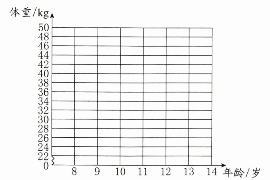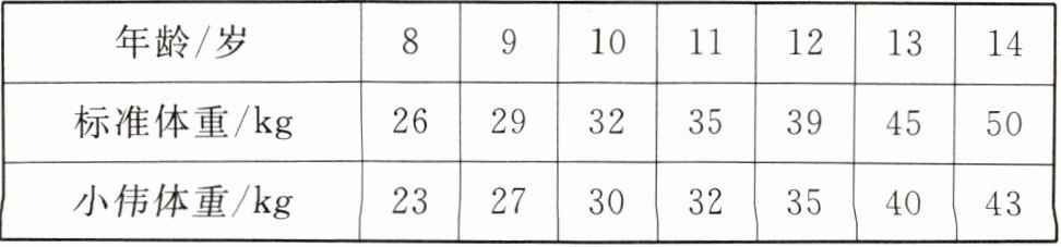三、小伟每年生日时都测体重。下表是他8~14岁时测得的体重与全国同龄男生标准体重的对照表。