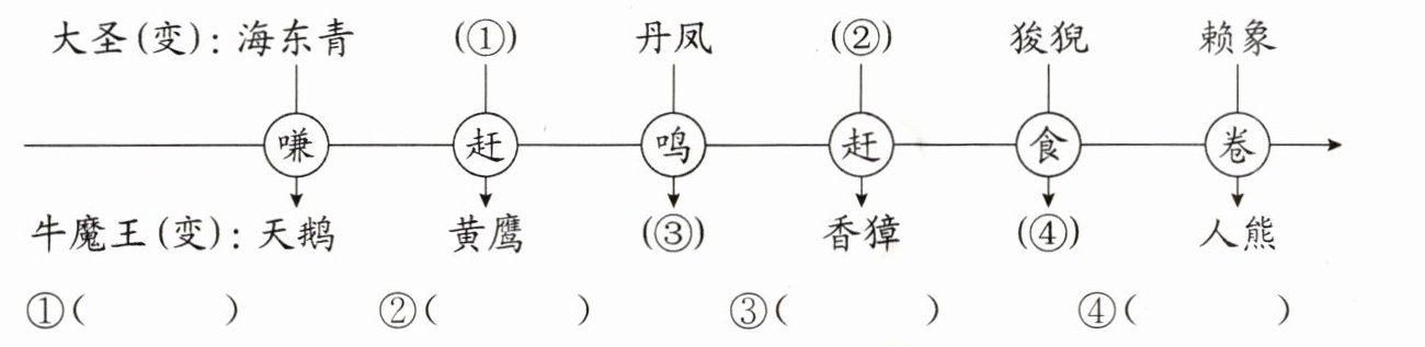 4.选文中,孙悟空和牛魔王会根据对方的变化而变化。孙悟空和牛魔王还会变成什么?发挥想象,仿照文中写法,写一写。