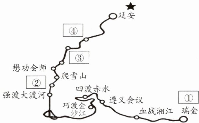 6. 如图是长征路线图,请你给相应的位置选择恰当的内容,并将序号填在横线上。