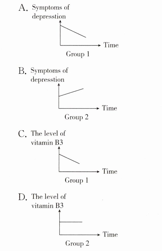 One or two weeks later, the scientists tested the mental(心理的) health of everyone. The symptoms of depression(抑郁症的症状) went down by 42% for the first group and 18% for the second. At the same time, the level(水平) of vitamin B3 went up by 86% for everyone in the first group. The scientists said that having more vitamin B3 could help with this study.