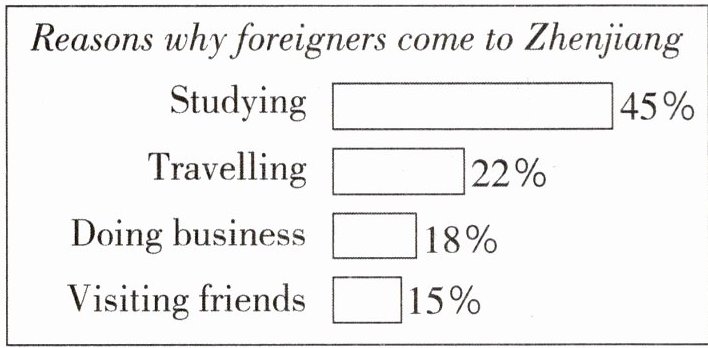 例 1 (镇江中考)Look at the picture below. According to a survey among one hundred foreigners in Zhenjiang, ____ of them come because they do business here.