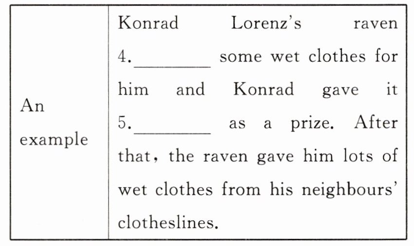 Sometimes a raven can be too clever. A scientist named Konrad Lorenz kept a raven named Roah. One day, Roah picked up some wet clothes that had fallen off Dr Lorenz's clothesline(晒衣绳). The scientist gave the helpful bird some food. After that, Roah gave the scientist a lot of wet clothes from his neighbours' clotheslines!