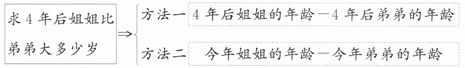 求4年后姐姐比弟弟大多少岁→$\left\{\begin{array}{l} \text{方法一} \quad 4\text{年后姐姐的年龄}-4\text{年后弟弟的年龄} \\ \text{方法二} \quad \text{今年姐姐的年龄}-\text{今年弟弟的年龄} \end{array} \right.$