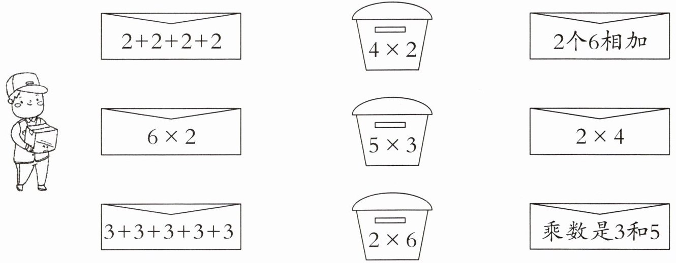 解析:题目考查乘法算式的意义,乘法是求几个相同加数和的简便运算,$6×2$表示$2$个$6$相加或$6$个$2$相加,$3×5$表示$5$个$3$相加或$3$个$5$相加,用“$◯$”画图表示即可。