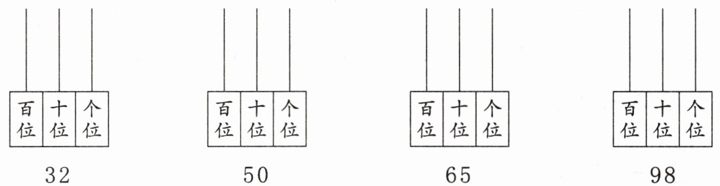 98:在计数器的十位上画9颗珠子,个位上画8颗珠子。