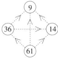 3. 仔细观察下图中的“>”和“<”,把9、14、36、61填在相应的$◯$里。