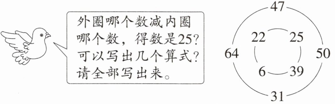 外圈哪个数减内圈哪个数,得数是25?可以写出几个算式?请全部写出来。
