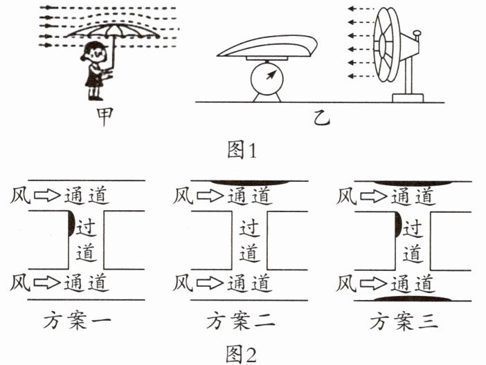 (填“大”或“小”)。(2)为解决某地下商城“工”字形通道中过道的通风问题,技术员设计了几种方案(如图2)。弧形部分为墙面凸出部分,其中最有效的是方案