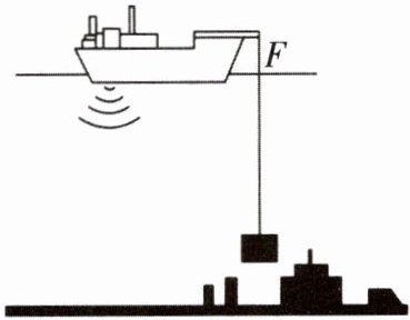 9. 在某海域装满货物的密封集装箱意外落入水中。已知集装箱重100t,体积为$40m^{3}$,沉入60m深的海底(未陷入),利用如图所示的打捞船进行打捞。($ρ_{海水}= 1.1×10^{3}kg/m^{3}$,g取10N/kg)根据以上信息计算: