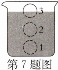 7. 将乒乓球压入水底,松手后乒乓球上浮过程中经过位置1和位置2,最终在位置3静止,如图所示。则乒乓球(