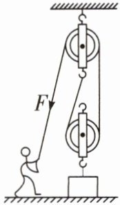 4. 如图所示,工人用滑轮组运送货物上楼,绳重和摩擦忽略不计,每个滑轮重120N,工人对绳端的拉力F= 300N,此时货物匀速上升,则货物重