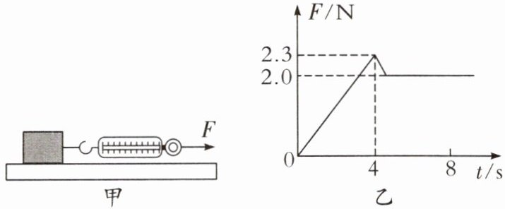 4. 小宇用图甲所示装置探究影响滑动摩擦力大小的因素时发现:在木块没有被拉动时,弹簧测力计也有示数,且示数会变化。若某次实验从开始拉木块到木块匀速滑动的F-t图像如图乙所示,其中0~4s时木块处于静止状态。由图乙可知:要使木块由静止开始运动,至少要用
