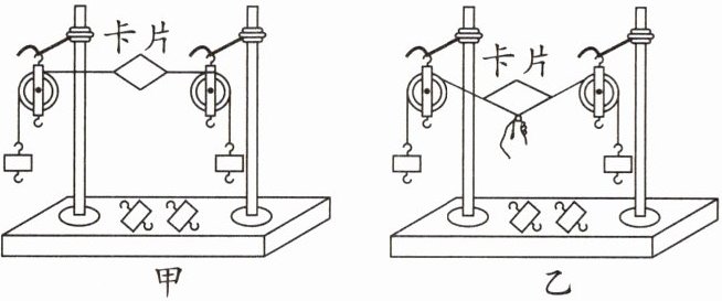 (2)为探究不在同一条直线上的两个力能否平衡,小明竖直向下拉卡片,如图乙所示。小华提醒该操作不可行,原因是没有控制两个拉力的