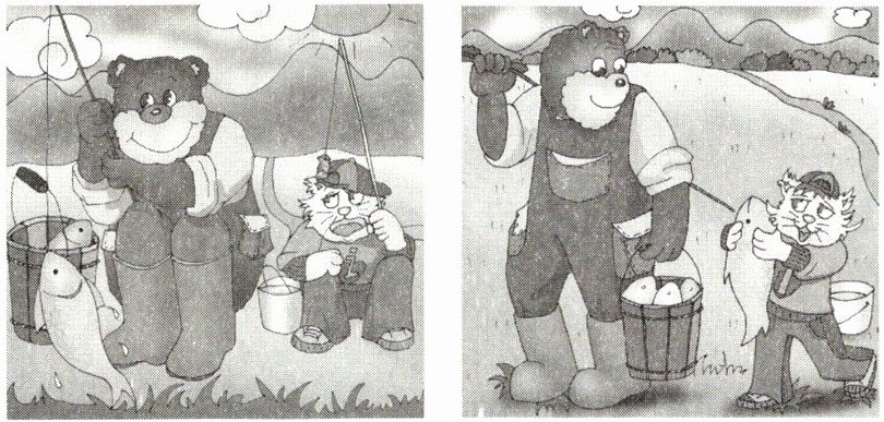 小熊早早地来到湖边,熟练地放下钓竿,不一会儿就钓到了一条又一条大鱼,鱼桶很快就装满了。而小猫呢,坐在那里等了好久,钓竿却一动不动。小猫饿得肚子咕咕叫,忍不住啃起了手指。