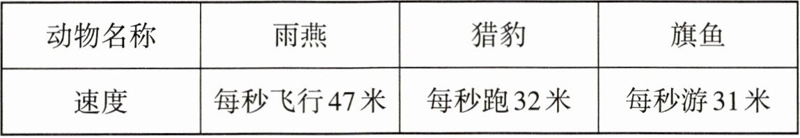 (3)问题:旗鱼$15$秒能游多少米?解答:旗鱼$15$秒能游$465$米。(答案不唯一)