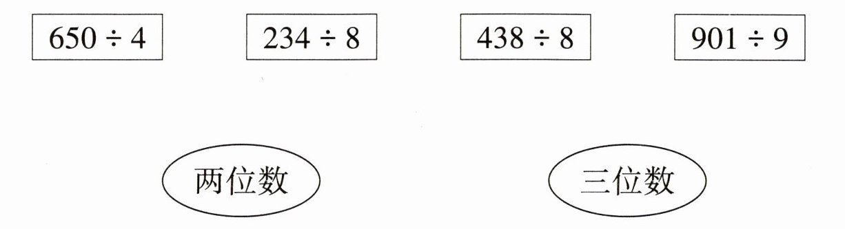 $650÷4$连三位数;$234÷8$连两位数;$438÷8$连两位数;$901÷9$连三位数。