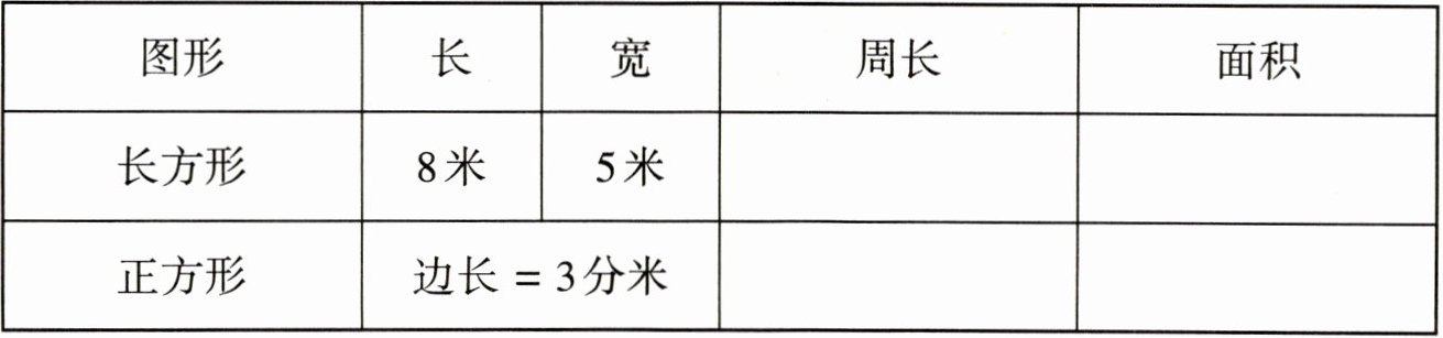 长方形:周长$26$米,面积$40$平方米;正方形:周长$12$分米,面积$9$平方分米。